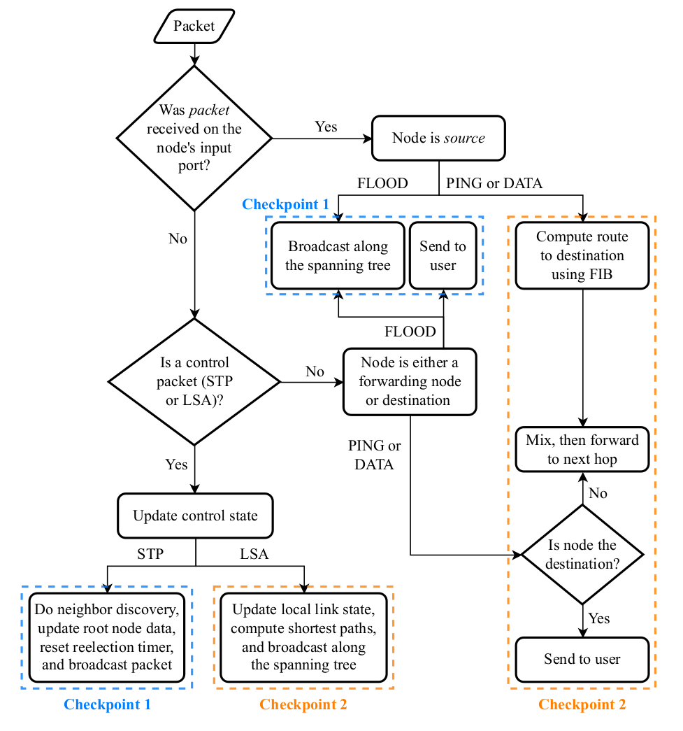 - Mixnet uses the Spanning Tree Protocol (STP) to create a loop-free topology, enabling safe and efficient broadcast of control messages across the network.